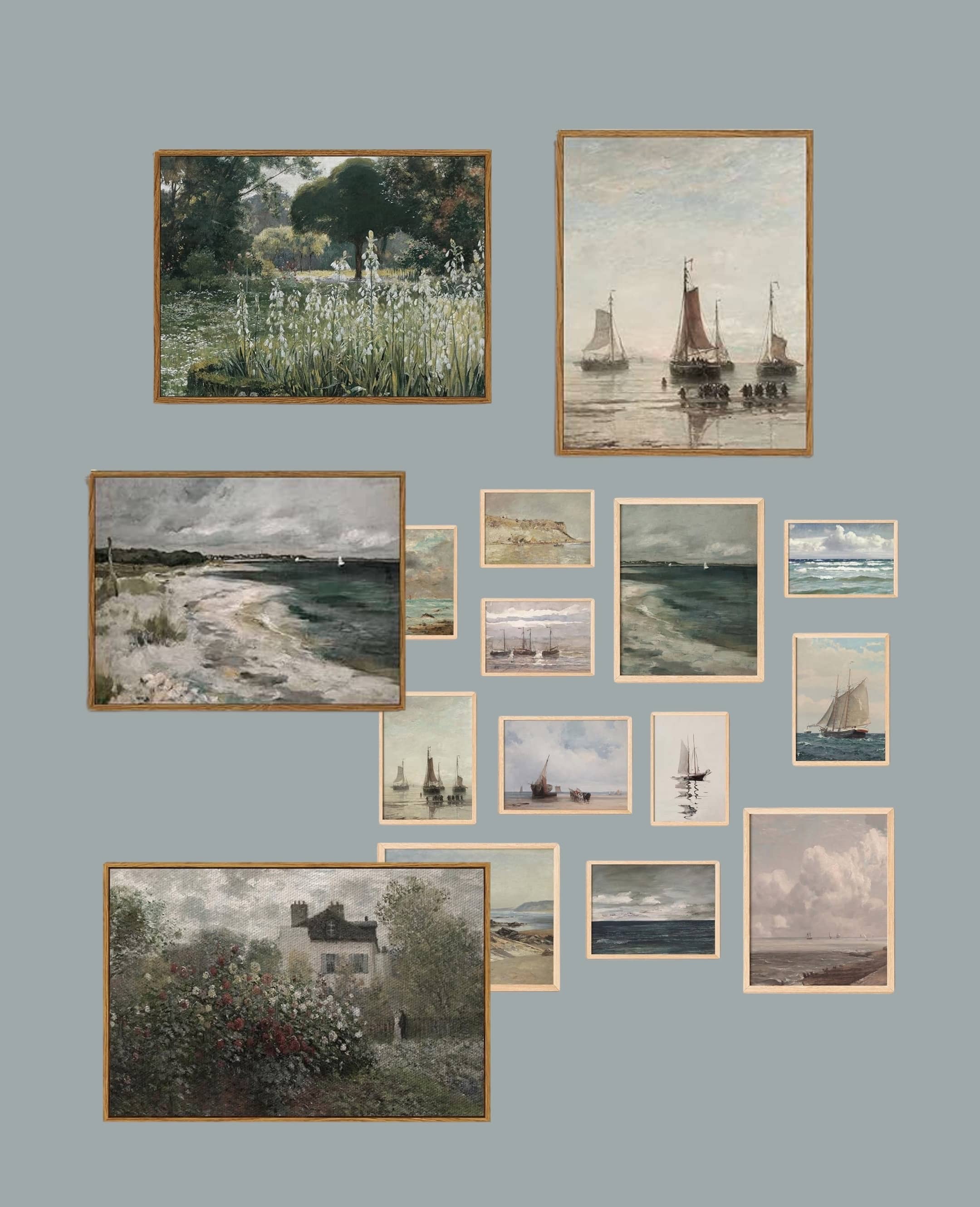 Here are some online coastal and pretty landscape artwork sources + some collages of my favorite art finds: